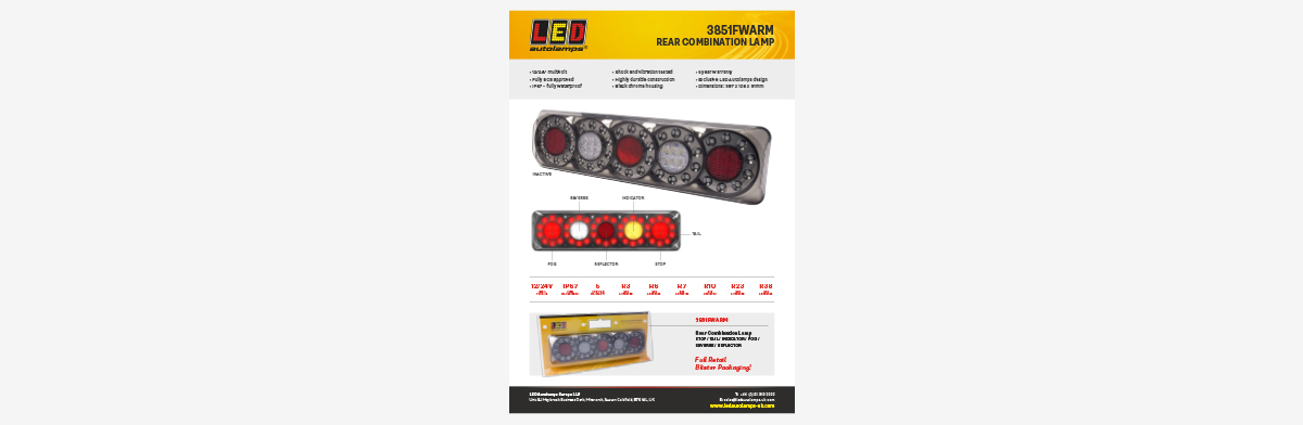 The 3851FWARM combines Stop, Tail, Indicator, Fog, Reverse and Reflector functions, each fully ECE approved and each utilising highly efficient LED technology.