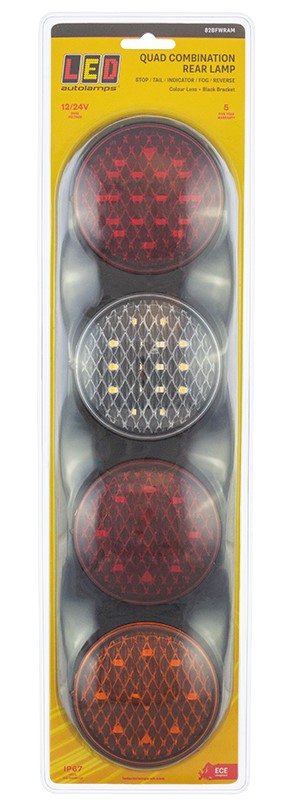 The 82BFWRAM is a 12/24V Multivolt Quad Combination Rear Lamp with bright LED Stop / Tail / Indicator / Fog / Reverse lights housed behind colour lenses in a black bracket which displays no visible screws.